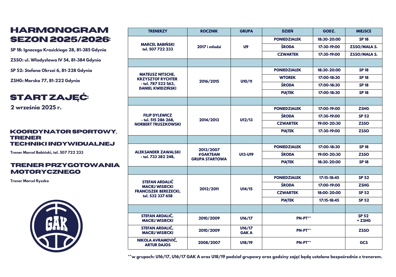 (*OD 2 WRZEŚNIA 2025) HARMONOGRAM ZAJĘĆ NA SEZON 2025/2026 GAK GDYNIA